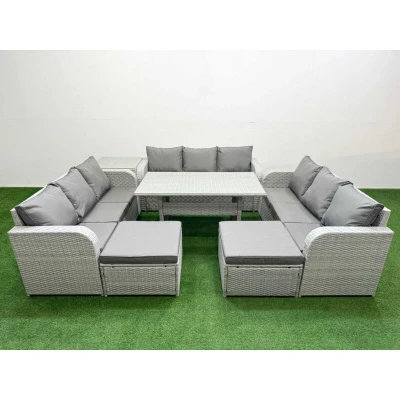 General description This 11-seater deluxe garden furniture set enhances your outdoor space, including courtyards, decks, backyards, porches, and swimming pools. Constructed from high-quality PE rattan and durable galvanized steel, it is designed to withstand adverse weather conditions in the UK. The set can be easily rearranged into various configurations to suit your needs. Technical specifications 3 x 3-seater Sofa Size: 177W x 67D x 79H cm 1 x Side Table Size: 65L x 65W x 66H cm 2 x Big Footstools Size: 65L x 65W x 34H cm 1 x Dining Table Size: 140L x 80W x 68H cm Material: Light grey PE rattan with dark grey fabric Seat Cushion Thickness: 8 cm Glass Thickness: 5 mm tempered glass Installation The furniture comes flat packed and is easy to assemble. It features sturdy galvanized steel tube frames with powder coating to prevent rust. Usage For low maintenance, the cushion covers are removable. It is recommended to keep the cushions indoors or use a rain cover when not in use. To
