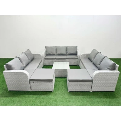 General description This 11-seater deluxe garden furniture set enhances the beauty of your courtyard, deck, backyard, porch, or swimming pool. Made from high-quality PE rattan and durable galvanized steel, it is designed to withstand adverse weather conditions and can be easily reconfigured to suit your needs. Technical specifications 3 x 3-seater Sofa Size: 177W x 67D x 79H cm 2 x Big Footstools: 65L x 65W x 34H cm 1 x Square Coffee Table: 65L x 65W x 34H cm Material: Light grey PE rattan with dark grey fabric Seat Cushion Thickness: 8 cm Glass Thickness: 5 mm tempered glass Installation Items come flat packed and are easy to assemble. Sturdy galvanized steel tube frames with powder coating to prevent rust. Usage Low maintenance with removable cushion covers. Keep cushions indoors or use a rain cover when not in use. Use a rain cover for the furniture if not in use for an extended period. Other information Factory direct sale guarantees quality and after-sale service. If there are