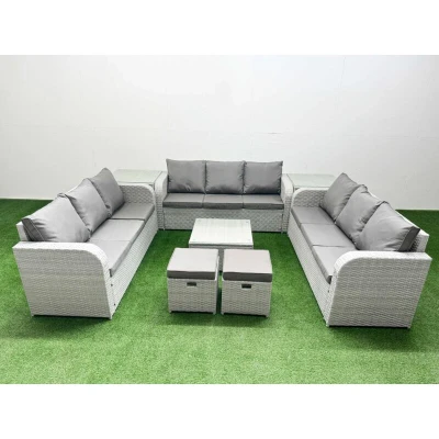 General description This 11-seater deluxe garden furniture set enhances the aesthetic of your courtyard, deck, backyard, porch, or swimming pool. Constructed from high-quality PE rattan and durable galvanized steel, it is designed to withstand adverse weather conditions in the UK. The set can be easily reconfigured to suit your needs at any time. Technical specifications 3 x 3-seater Sofa Size: 177W x 67D x 79H cm 2 x Side Table: 65L x 65W x 66H cm 2 x Fully Assembled Stools: 40W x 40D x 34H cm 1 x Square Coffee Table: 65L x 65W x 34H cm Material: Light grey PE rattan with dark grey fabric Seat Cushion Thickness: 8 cm Glass Thickness: 5 mm tempered glass Installation Items come flat packed and are easy to assemble. Sturdy galvanized steel tube metal frames with powder coating to prevent rust. Usage Low maintenance with removable cushion covers. Keep cushions indoors or use a rain cover when not in use. Use a rain cover if the furniture is not in use for an extended period. Other
