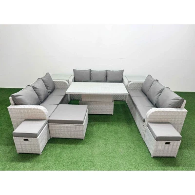 General description This 12-seater deluxe garden furniture set enhances the beauty of your courtyard, deck, backyard, porch, or swimming pool. Constructed from high-quality PE rattan and durable galvanized steel, it is designed to withstand adverse weather conditions and can be easily reconfigured to suit your needs. Technical specifications 3 x 3-seater Sofa Size: 177W x 67D x 79H cm 2 x Side Table: 65L x 65W x 66H cm 1 x Big Footstool: 65L x 65W x 34H cm 2 x Fully Assembled Stools: 40W x 40D x 34H cm 1 x Lifting Table: 140L x 80W x 68/48H cm (height adjustable from 68 cm to 48 cm) Color: Light grey PE rattan with dark grey fabric Installation Items come flat packed and are easy to assemble. Sturdy galvanized steel tube frames with powder coating to prevent rust. Usage Keep the cushions indoors or use a rain cover when not in use. For long-term storage, cover the furniture with a rain cover. 8 cm thick seat cushions with soft pillow back cushions provide added comfort. Other