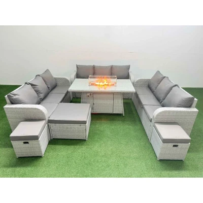 General description This Fimous PE Rattan Lounge Sofa Set is a stylish and comfortable 12-seater outdoor garden furniture set, featuring a firepit dining table, three-seater sofa, and three stools. The set is designed with light grey PE rattan and dark grey fabric, providing a modern look for your outdoor space. Technical specifications 3 x 3 Seater Sofa Size: 177W x 67D x 79H cm 1 x Big Footstool: 65L x 65W x 34H cm 2 x Fully Assembled Stools: 40W x 40D x 34H cm 1 x Firepit Dining Table Size: 140L x 80W x 69H cm Material: Light grey PE rattan with dark grey fabric Thickness of Glass: 5mm transparent tempered glass Cushion Thickness: 8 cm Installation Items come flat packed and are easy to assemble. Sturdy galvanized steel tube metal frames with powder coating to prevent rust. Usage Place the gas fire pit on the glass top, not under the glass. Do not cover the igniter with lava rocks. Check for any gas leakage at the joints or hose before use. Keep the cushions indoors or use a rain