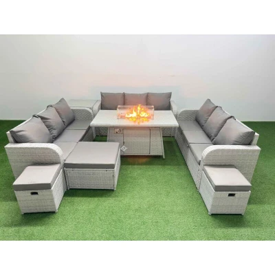 General description This Fimous PE Rattan Lounge Sofa Set is a stylish and comfortable 12-seater outdoor garden furniture set, featuring a firepit dining table, three-seater sofa, and three stools. The set is designed for durability and ease of use, making it perfect for outdoor gatherings. Technical specifications 3 x 3 Seater Sofa Size: 177W x 67D x 79H cm Side Table Size: 65L x 65W x 66H cm Big Footstool Size: 65L x 65W x 34H cm Fully Assembled Stools Size: 40W x 40D x 34H cm (2 pieces) Firepit Dining Table Size: 140L x 80W x 69H cm Material: Light grey PE rattan with dark grey fabric Seat Cushion Thickness: 8 cm Installation Items come flat packed and are easy to assemble. Sturdy galvanized steel tube metal frames with powder coating to prevent rust. Usage It is recommended to use a 5 kg gas tank for the fire pit. Before using the fire pit, check for any leakage at the joints or hose. Keep the cushions indoors or use a rain cover when not in use. Cover the furniture with a rain