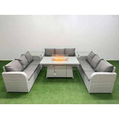 General description This Fimous PE Rattan Lounge Sofa Set is a stylish and comfortable 9-seater outdoor garden furniture set, featuring a firepit dining table, three-seater sofas, and two side tables. The set is designed with light grey PE rattan and dark grey fabric, providing a modern aesthetic for your outdoor space. Technical specifications 3 x 3-seater Sofa Size: 177W x 67D x 79H cm 2 x Side Table Size: 65L x 65W x 66H cm Firepit Dining Table Size: 140L x 80W x 69H cm 8 cm Thick Seat Cushion with Soft Pillow Back Cushion Material: Light grey PE rattan with dark grey fabric 5mm Thickness Transparent Tempered Glass Installation Items come flat packed and are easy to assemble. Sturdy galvanized steel tube metal frames with powder coating to prevent rust. Usage Place the gas fire pit on the glass top, not under the glass. Do not cover the igniter with lava rocks. Check for any gas leakage at the joints or hose before use. Keep the cushions indoors or use a rain cover when not in use.