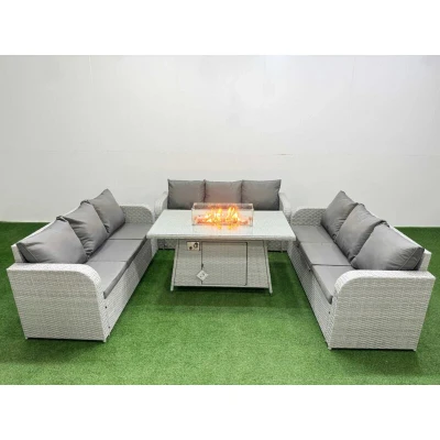 General description This Fimous PE Rattan Lounge Sofa Set is a stylish and comfortable 9-seater outdoor garden furniture set, featuring a firepit dining table and light grey PE rattan with dark grey fabric cushions. The set is designed for durability and low maintenance, making it an ideal choice for outdoor gatherings. Technical specifications 3 x 3 Seater Sofa Size: 177W x 67D x 79H cm Firepit Dining Table Size: 140L x 80W x 69H cm 8 cm Thick Seat Cushion Material: Light grey PE rattan with dark grey fabric 5mm Thickness Transparent Tempered Glass Sturdy Galvanized Steel Tube Metal Frames with Powder Coating Installation Items come flat packed and are easy to assemble. Usage Place the gas fire pit on the glass top, not under it. Do not cover the igniter with lava rocks. Check for any gas leaks at the joints or hose before use. Use a 5 kg gas tank for optimal performance. Keep cushions indoors or use a rain cover when not in use. Use a rain cover for the furniture if not in use for