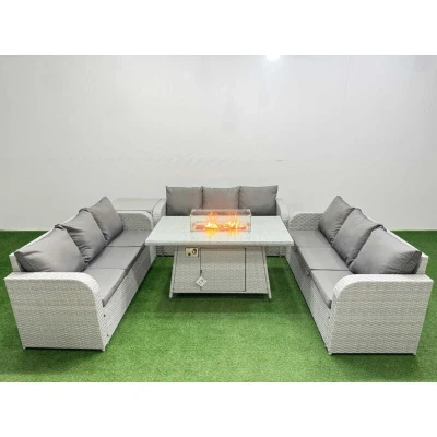 General description This Fimous PE Rattan Lounge Sofa Set is a stylish and comfortable 9-seater outdoor garden furniture set, featuring a firepit dining table and a 3-seater sofa. The set is designed for durability and low maintenance, making it perfect for outdoor use. Technical specifications 3 x 3-seater Sofa Size: 177W x 67D x 79H cm Side Table Size: 65L x 65W x 66H cm Firepit Dining Table Size: 140L x 80W x 69H cm Material: Light grey PE rattan with dark grey fabric Seat Cushion Thickness: 8 cm Glass Top Thickness: 5 mm transparent tempered glass Installation Items come flat packed and are easy to assemble. Sturdy galvanized steel tube metal frames with powder coating to prevent rust. Usage Place the gas fire pit on the glass top, not under it, and do not cover the igniter with lava. Check for any gas leakage at the joints or hose before use. Keep the cushions indoors or use a rain cover when not in use. Use a rain cover for the furniture if not used for a long time. Other