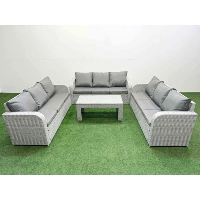 General description This 9-seater deluxe garden furniture set enhances the beauty of your courtyard, deck, backyard, porch, or swimming pool. Made from high-quality PE rattan and durable galvanized steel, it is designed to withstand adverse weather conditions and can be easily reconfigured to suit your needs. Technical specifications 3 x 3-seater Sofa Size: 177W x 67D x 79H cm 1 x Rectangular Coffee Table: 105L x 50W x 48H cm Material: Light grey PE rattan with dark grey fabric Seat Cushion Thickness: 8 cm Tempered Glass Thickness: 5 mm Installation Items come flat packed and are easy to assemble. Sturdy galvanized steel tube metal frames with powder coating to prevent rust. Usage Keep cushions indoors or use a rain cover when not in use. Use a rain cover for the furniture if not in use for an extended period. Other information Removable cushion covers for easy maintenance. Factory direct sale guarantees quality and after-sale service. If there are any issues with assembly, missing