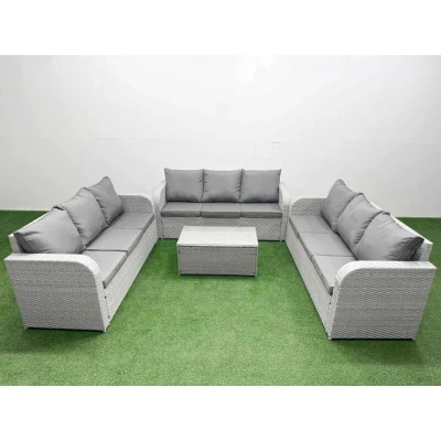 General description This 9-seater deluxe garden furniture set enhances your outdoor space, including courtyards, decks, backyards, porches, and swimming pools. Constructed from high-quality PE rattan and durable galvanized steel, it is designed to withstand adverse weather conditions in the UK. The set can be easily reconfigured to suit your needs. Technical specifications 3 x 3-seater Sofa Size: 177W x 67D x 79H cm 1 x Oblong Coffee Table Size: 85L x 50W x 37H cm Seat Cushion Thickness: 8 cm Material: Light grey PE rattan with dark grey fabric Glass Tabletop: 5mm thickness transparent tempered glass Installation Items come flat packed and are easy to assemble. Sturdy galvanized steel tube frames with powder coating to prevent rust. Usage Keep cushions indoors or covered with a rain cover when not in use. Use a rain cover for the furniture if not in use for an extended period. Other information Flat PE rattan is completely handmade. Removable cushion covers for easy maintenance. For