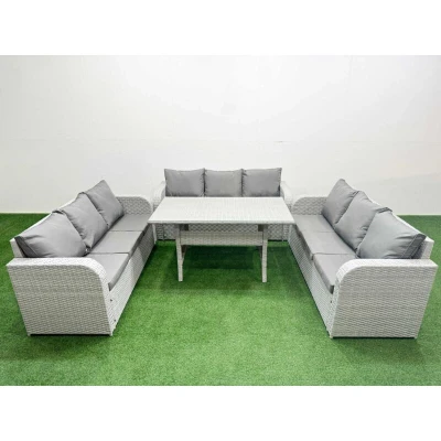 General description This 9-seater deluxe garden furniture set enhances the beauty of your courtyard, deck, backyard, porch, or swimming pool. Constructed from high-quality PE rattan and durable galvanized steel, it is designed to withstand adverse weather conditions. The set can be easily configured into different arrangements to suit your needs. Technical specifications 3 x 3-seater Sofa Size: 177W x 67D x 79H cm Dining Table Size: 140L x 80W x 68H cm Material: Light grey PE rattan with dark grey fabric Seat Cushion Thickness: 8 cm Glass Thickness: 5 mm tempered glass Installation Items come flat packed and are easy to assemble. Includes sturdy galvanized steel tube frames with powder coating to prevent rust. Usage Removable cushion covers for easy maintenance. Recommended to keep cushions indoors or use a rain cover when not in use. Use a rain cover for the furniture if not in use for an extended period. Other information Factory direct sale guarantees quality and after-sales