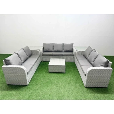 General description This 9-seater deluxe garden furniture set enhances the beauty of your courtyard, deck, backyard, porch, or swimming pool. Made from high-quality PE rattan and durable galvanized steel, it is designed to withstand harsh weather conditions. The set can be easily rearranged into various configurations to suit your needs. Technical specifications 3 x 3-seater Sofa Size: 177W x 67D x 79H cm 2 x Side Table Size: 65L x 65W x 66H cm 1 x Square Coffee Table Size: 65L x 65W x 34H cm Seat Cushion Thickness: 8 cm Material: Light grey PE rattan with dark grey fabric Glass Thickness: 5 mm tempered glass Installation Items come flat packed and are easy to assemble. Sturdy galvanized steel tube frames with powder coating to prevent rust. Usage Keep cushions indoors or use a rain cover when not in use. Use a rain cover for the furniture if not in use for an extended period. Other information Removable cushion covers for easy cleaning. For any assembly issues, missing parts, or