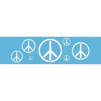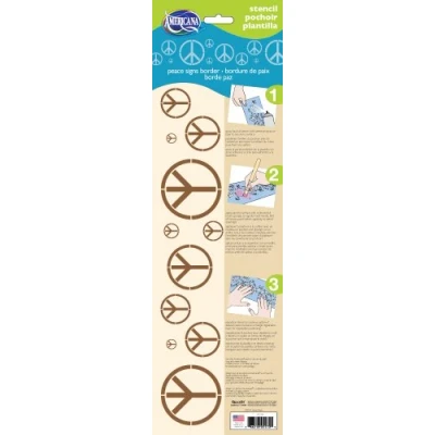 Peace Signs Border - Decoart Americana Stencil - 6" x 18" Peace Signs Border design. Features:- Laser cut stencils will produce clean, crisp lines. Repeating patterns have registration guide marks for perfect repeats. Letter and number stencils have baseline guideline markings for accuracy. Can be used with any paint or texture product. Stencils lie flat and are durable enough for repeated use. Will not warp or become hard to use. There are a variety of trendy designs for every aspect of home decorating, and for every room in your house. Helpful Hints:- ÔøΩSpray back of stencil with adhesive spray, or tape to secure to surface. ÔøΩ Apply paint to surface with roller, stencil brush, sponge or rag. ÔøΩ Reposition stencil to continue pattern as desired. Uses:- ÔøΩWoodÔøΩ PaperÔøΩ FabricÔøΩ CanvasÔøΩ GlassÔøΩPlasticÔøΩ CurtainsÔøΩ Table clothsÔøΩ PlacematsÔøΩ FramesÔøΩ WallsÔøΩ RugsÔøΩ Fabric purses/totesÔøΩ FurnitureÔøΩ Wall hangingsÔøΩ T-Shirts Sold as a SINGLE stencil. There are numerous designs within the range to choose from. Use DecoMagic Brush Cleaner immediately after use to prevent paint buildup CLDAAS104 MPN AS104-K
