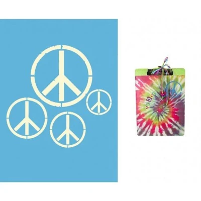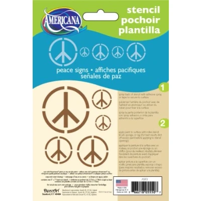 Peace Signs - Decoart Americana Stencil - 5" x 7" Peace Signs design. Features:- Laser cut stencils will produce clean, crisp lines. Repeating patterns have registration guide marks for perfect repeats. Letter and number stencils have baseline guideline markings for accuracy. Can be used with any paint or texture product. Stencils lie flat and are durable enough for repeated use. Will not warp or become hard to use. There are a variety of trendy designs for every aspect of home decorating, and for every room in your house. Helpful Hints:- ÔøΩSpray back of stencil with adhesive spray, or tape to secure to surface. ÔøΩ Apply paint to surface with roller, stencil brush, sponge or rag. ÔøΩ Reposition stencil to continue pattern as desired. Uses:- ÔøΩWoodÔøΩ PaperÔøΩ FabricÔøΩ CanvasÔøΩ GlassÔøΩPlasticÔøΩ CurtainsÔøΩ Table clothsÔøΩ PlacematsÔøΩ FramesÔøΩ WallsÔøΩ RugsÔøΩ Fabric purses/totesÔøΩ FurnitureÔøΩ Wall hangingsÔøΩ T-Shirts Sold as a SINGLE stencil. There are numerous designs within the range to choose from. Use DecoMagic Brush Cleaner immediately after use to prevent paint buildup. CLDAAS03 MPN AS03-K