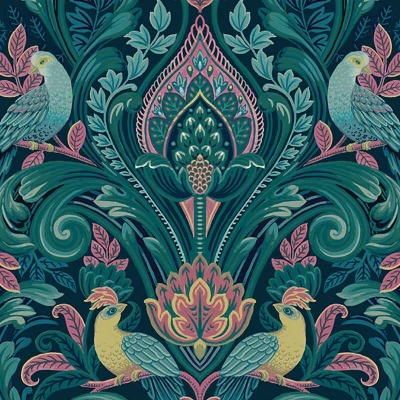 Peacock Themed Damask Style Textured Vinyl Bold Coloured Wallpaper in Navy Blue/Pink Perfect for Feature Walls Living Rooms Bedroom Decoration Grandeco A67801