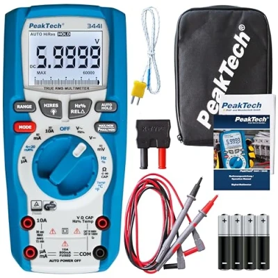 TRUE RMS MEASUREMENT DEVICE: The P 3441 True RMS Digital Multimeter from PeakTech is ideal for the everyday work of electronics engineers, engineers and technicians thanks to its wide range of measurement functions FEATURES: In addition to measuring functions for current, voltage, capacitance as well as resistance, the voltmeter has a 4-20 mA% current loop measurement, a low-pass filter & an auto-hold function ADJUSTABLE LCD DISPLAY: The 60,000 count measurement display can be switched from a 3 5/6 digit to a 4 5/6 digit display. All measurements are thereby recorded as true effective value MULTIPLE APPLICATIONS: Due to the many technical features, the meter with voltage and continuity tester is ideal for daily use in the service, construction or industrial sector INFO: TÜV/GS, EN 61010-1; CAT III 1000 V/ CAT IV 600 V; 1000V AC/DC; Accessories: Bag, test lead, Type-K temperature probe, temperature adapter, battery, manual; Dimensions: 80 x 175 x 50 mm; Weight: 400 g