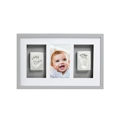 Includes one grey frame with white matting, plus impression material, rolling pin, shaping ruler, background board, double-sided tape, acid-free beveled mat and instructions for creating impressions of your baby’s hand and foot Dimensions: 42 x 24 cm // photo insert: 10 x 15 cm Features sawtooth hanger for displaying on the wall in your baby’s nursery or anywhere in your home or office Carefully crafted handprint and footprint kit is ready to use and doesn’t require baking or mixing, which makes this a quick and easy craft project to complete with your baby This excellent gift for a christening, baptism or any new baby occasion arrives in gift-ready packaging for your convenience Mum and dad are sure to cherish this sweet display of their little one’s handprint and footprint for years to come