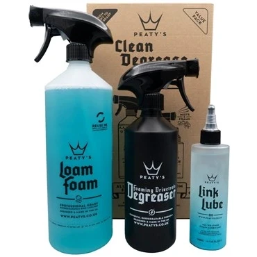 Essential Bike Cleaning Kit: Peaty's Wash, Degrease, Lubricate bicycle cleaning kit contains everything you need for a spotless, high-performance finish. Ideal for MTB, road and gravel bikes, it delivers a deep clean, degrease and long-lasting lubrication Safe On All Bikes: Our readily biodegradable bike cleaning and maintenance products are designed to tackle tough dirt and grime while being kind to both your bike and the environment. Safe for use on all bike surfaces including carbon LoamFoam Bike Cleaner: Peaty's LoamFoam bike wash is a minty fresh, professional-grade, biodegradable cleaner that provides powerful deep cleaning action with minimal effort Foaming Drivetrain Degreaser Spray: Our drivetrain degreaser is the ultimate bike specific, high strength foaming bike degreaser. Its foaming formula increases contact time to thoroughly remove dirt and oils without stripping precious bearing greases LinkLube All-Weather Bike Chain Lube: Our LinkLube bike chain lubricant penetrates and cleans deep inside the chain, working to drive out moisture, grit and grime and replace them with a unique blend of oils and waxes to lubricate and protect