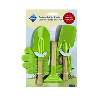 Garden set for children 2 different shovels with wooden handle, colour: green Rake with wooden handle, colour: green 1 pair of gloves, colour: green with hedgehog image Ideal for small hobby gardeners, Manufacturer: Peter Bausch GmbH & Co. KG