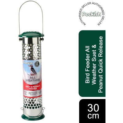General description Peckish All Weather Suet & Peanut Feeder is designed for easy filling and hanging, making it a convenient choice for bird enthusiasts. The feeder features a removable plastic insert that helps reduce mess during cleaning. Technical specifications Size: 30 cm Material: Perforated stainless steel Features: Quick-release base for easy cleaning Usage Remove the lid at the top of the feeder and fill it with Peckish Peanuts. Hang the feeder from a tree, dining station, or universal feeder hook. Place the feeder 2 meters from cover to make it visible while providing a safe retreat for birds. Feed birds at the start of the day to help them regain energy lost overnight. Maintain a consistent feeding routine to support birds throughout the year, especially during breeding, nesting, and fledgling periods. Ensure feeders are located near cover for easy access, but not too close to avoid predators. Provide fresh, clean water for drinking and bathing. Regularly clean feeding