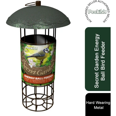 General description Peckish Secret Garden Energy Ball Feeder helps to transform the garden while attracting a wide variety of birds. Its decorative leaf design and antique finish make it a charming addition to any outdoor space. Technical specifications Material: Hard-wearing metal Design: Decorative leaf design with an antique finish Structure: Metal wire structure ideal for clinging birds Usage Unscrew the top of the feeder and place the Energy Balls inside. Hang from a tree, dining station, or from a universal feeder hook. Site your feeder 2 meters from covers, such as trees or shrubs, to make it visible while providing a safe retreat for birds. Put out food at the start of the day to help birds replace energy lost overnight. Feed garden birds all year round, especially during breeding, nesting, and fledgling periods. Locate feeder stations near cover for easy access, but not too close to avoid predators. Ensure fresh clean water is available for drinking and bathing. Clean feeding