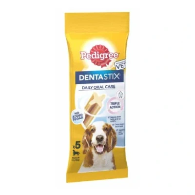• DentaStix Daily Oral Care dental chews for dogs are scientifically proven to reduce tartar build up by up to 80% when fed daily. • Pedigree DentaStix Daily Oral Care dog dental chew sticks were developed with the help of vets and nutritionists at The Waltham Centre. • Dentastix dental treats for dogs are low in fat, with no added sugar and free from artificial colours and flavours; a healthy dog treat with benefits. • Pedigree daily dog chews available in single & multipack & in different sized packs to provide effective oral care for small, medium and large dogs. • At Pedigree we are committed to building a better world for us and our dogs. Our cardboard boxes are 100% recyclable. Inner sachets are not yet. We are working on it!Dogs love to explore the world through their mouth, so its important to take care of their teeth. Pedigree Dentastix Daily Oral Care chews with TRIPLE ACTION are scientifically proven to reduce the build-up of tartar by up to 80%, clean hard to reach teeth and support gum health. Nutrition: Analytical constituents (%): Protein: 8.1, Fat content: 1.3, Inorganic matter: 6.3, Crude fibre: 0.20, Moisture: 15.4, Energy: 301 kcal/100 g, Additives per kg:, Nutritional additives:, Vitamin E: 1365 mg, Zinc (Zinc sulphate, heptahydrate): 193 mg, Sensory additives:, Chicken flavour: 44.6 mgPreparation and Usage: Feeding instructions: Medium dogs e.g. Cocker Spaniel, feed 1 stick per day. This is a chewy treat that is only suitable for dogs between 10 kg and 25 kg. It is not suitable for young puppies under 4 months. Use within 14 days of opening. Fresh drinking water should always be available.Ingredients: Cereals, Derivatives of Vegetable Origin, Minerals (including Sodium Tripolyphosphate 2.3%), Meat and Animal Derivatives, Oils and FatsAt Pedigree we believe that every dog deserves a loving home, and that every dog deserves leading nutrition, care, and treats. Pedigree offers delicious dog treats, oral care dog chews, & 100% main meals for dogs.