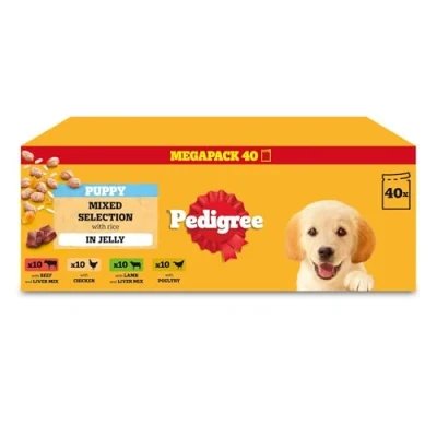 FORTY POUCH MULTIPACK: Includes forty (40) 100g pouches of PEDIGREE Puppy dog food; provides convenient meals for growing puppies FOUR DELICIOUS FLAVOURS: with beef & liver, chicken, lamb & liver and poultry; variety keeps mealtimes exciting for your puppy BALANCED NUTRITION FOR GROWTH: Contains balanced levels of calcium and phosphorus; supports healthy development during your puppy's crucial growth stage QUALITY INGREDIENTS: Made with carefully sourced ingredients; delivers nutritious meals your puppy will love FREE FROM: artificial flavours, colours, and preservatives; Made with Natural Ingredients and Vitamin E to support natural defences