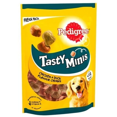 General description Complementary pet food for adult dogs. Succulent bitesize mini dog treats - PEDIGREE, Tasty Minis are delicious little dog chew treats in a range of tasty flavours and textures. Ideal for training, rewarding, or just treating your dog at any time. Technical specifications Weight: 130g Flavour: Chicken & Duck Fat content: less than 5% / 100g Contains Omega 3 Contains Vitamin E Includes minerals such as Calcium Other information No artificial colours or flavours
