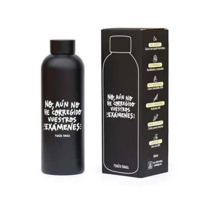 ❄️ COLD DRINKS FOR 24 HOURS ❄️ - 🔥 HOT DRINKS 12 HOURS 🔥- Pedrita Parker stainless steel water bottles are made with double wall, which completely insulates its contents. Drinks will stay hot for up to 12 hours and cold up to 24. The double wall feature also prevents condensation and burns on the outside of the bottle. 🍃 ECO-FRIENDLY AND FOOD SAFE BPA FREE: All contact surfaces are guaranteed safe and BPA free; The steel we use is 18/8, or 304 grade, also known as food grade stainless steel. It will not rust inside or out and keeps the taste and of your favorite beverages. No more disposable plastic bottles thanks to the reusable and sustainable bottle of Pedrita Parker. 💧SAFE & LEAKPROOF: This insulated bottle features a tight screw closure that ensures no leaks. Its excellent sealing ability prevents any accidental spillage. Always carry it with you without worrying about anything spilling in your bag. FUN DESIGN: Insulated bottle in black and matte finish with capacity of 500ml and with the phrase "No, I haven't corrected your exams yet" printed in white. 🔥 PEDRITA PARKER: Quality, lots of love and little embarrassment is what characterizes all our designs. But besides being good, they will bring a smile to you. By buying our products, you are supporting a brand of Malaga of 5 people to do every day what we like best.