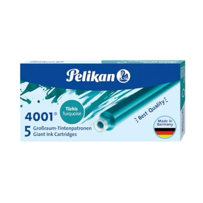 Pelikan Large Capacity Ink Cartridges with Ink 4001 in Turquoise Suitable for fountain pens with large capacity ink cartridges as well as for many other fountain pens. The 4001 ink guarantees an even ink flow, an expressive typeface and bright colours. The Pelikan ink cartridges are made in Germany. Quality made in Germany - Made by. Pelikan. You will receive the ink 4001 in 5 large capacity ink cartridges, packed in a folding box