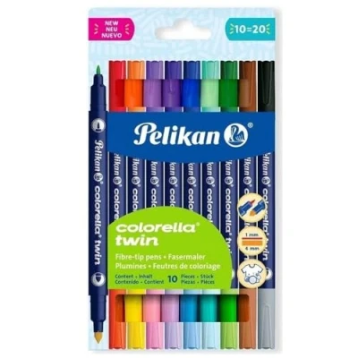 Pelikan Colorella Twin Fibre Tip Pens, Pack of 10 Double Colour Pens with Dual Tips, 20 Colours, Washable Water Based Ink