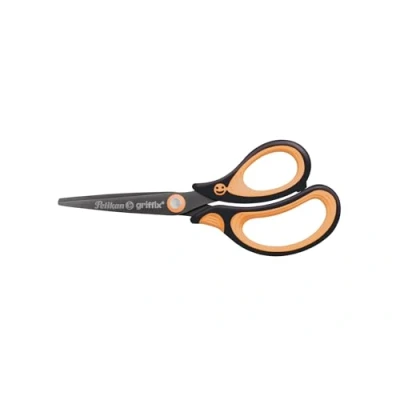 The Pelikan griffix scissors with pointed blade are particularly suitable for children who have already had experience with cutting. The blade of the school scissors is 3 x harder than steel thanks to a titanium nitride coating. Thanks to the ergonomic handle, the scissors fit particularly well in the hand with children. The hard and soft, high-quality plastic of the handle is PVC and latex free. The school scissors are tailored to the needs of right-handed users; the laughing griffix face ensures the correct hand posture. Box contents: 1 x griffix school scissors pointed for right-handed users in neon black