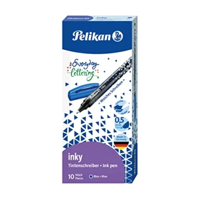 Ink pen with ink regulator system and large transparent window Line width: approx. 0.5 mm Plastic tip, shaft: printed, transparent Ink colour: blue (erasable), cap in ink colour Pack of 10