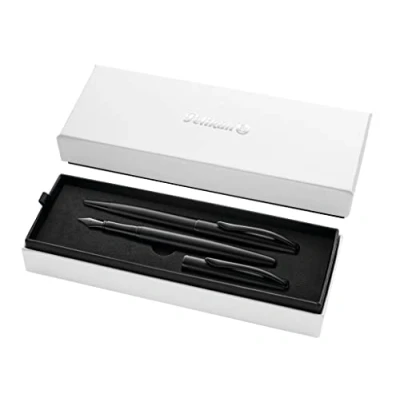 Ballpoint and fountain pen set Shimmering black lacquer with polished black trim The Ballpoint Pen it is fitted with blue ink refill and it does have a twist mechanism while the Fountain Pen comes with 1 blue ink cartridge and it does have a stainless steel medium nib Presented in Pelikan gift box Made in Germany