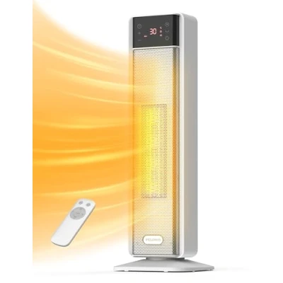 MORE EVEN AND INSTANT HEATING: This electric space heaters features dual DC motors and reliable ceramic heating technology, warming up quickly in just 3 seconds; It provides quiet and even heat distribution, warming your entire body and dispelling the cold; Unlike traditional PTC electric heaters, it offers a comfortable feeling without any scorching sensation 10% WIDER COVERAGE: Equipped with a 23-inch large PTC heating screen and 75° horizontal oscillation, this electric room heater delivers 10% more powerful and wider heat coverage compared to other PTC tower heaters PROGRAMMABLE THERMOSTAT: With 3 heating options (High, Low, ECO mode) , this energy efficient space heater achieve customized temperature settings between 5°C and 35°C, maximizing efficiency and warmth; The ECO mode automatically adjusts to save energy based on the ambient temperature 24-HOUR TIMER: This portable heater comes with a 24-hour timer and a 60-second screen auto-off feature, ensuring you sleep undisturbed throughout the night while maintaining the ideal room temperature without frequent adjustments USER FRIENDLY ELECTRIC HEATER: Convenient LED touch controls and remote operation make settings easy; This quiet bedroom heater operates at a noise level of just 38dB; The handle at the back of the heater allows for easy portability, making it perfect for use in bedrooms, living rooms, studies, offices, or home gardens, Weight: 5.1 pounds, Manufacturer: PELONIS