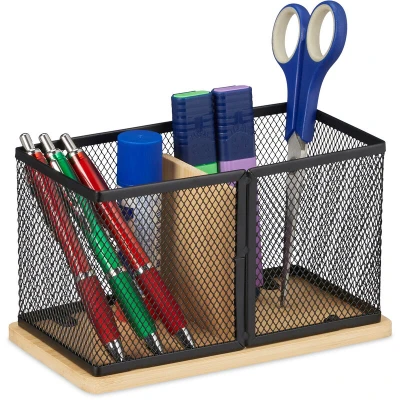 General description A tidy desk is the basis for productive work. With the Relaxdays Pen Holder, you can keep your workplace tidy and organized. This modern pen organizer features a stylish mix of natural bamboo and black mesh, making it not only a practical desk accessory but also an attractive addition to any workspace. Technical specifications Overall dimensions H x W x D: approx. 11 x 19 x 10 cm Dimensions per compartment H x W x D: approx. 10 x 8.5 x 9 cm Weight: approx. 270 g Material: Bamboo, iron Colour: Black, natural Usage Designed for storing pens, pencils, highlighters, scissors, rulers, and other office utensils. Features 2 compartments for clearly organized storage of office supplies. Helps create order on the desk for efficient working.