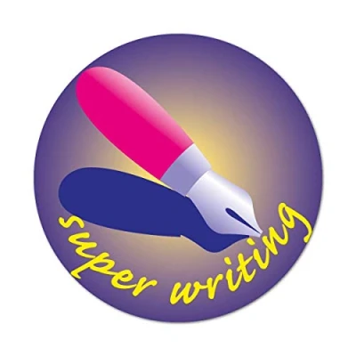 Stickers showing a pen with a 'super writing' Message 75 identical stickers per pack Each sticker measures 38mm in diameter