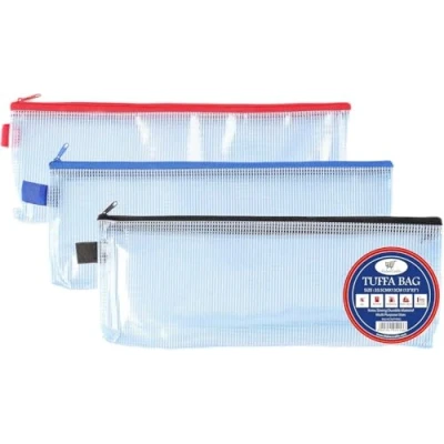 Habercrafts Heavy Duty Pencil Case Tuff Bag Zip Files, Each Wallet Measures 13cm x 33cm And Is Deigned To Fit Pencils And Rulers. Extremely Durable, Our Strong Plastic Pouches Are Made Of Heavy Duty Thickened Mesh Fused Material And Are Very Strong As Well As Being Water Resistant And Lightweight. Easily Keep Your Documents, Keepsakes And Contents Organised And Safe On The Go From Water, Dust And Damage. The Translucent Pouch Keep Contents Easily Visible And Organised, Making Finding Documents And Items Easy To Find Without Opening Your Folders. Great For Office, School, Travel And Home; Perfect For Storing Puzzle Pieces, Money, Household Bills, Important Documents, Paper, Text Books, Letters, Photos, Cosmetics Cheques, Receipts, Vouchers And Much More. Each Bag Has A Hanging Loop Which Matches The Colour Of The Zip (Blue/Black/Red). Available Packs Of 1 To 12 In 7 Sizes - A3 (45cm X 34cm), A4 (25cm X 36cm), A5 (17.5cm X 23cm), DL (11cm X 23cm), Mini (7cm X 15cm), Pencil Case (13cm X 33cm) And Triple Pack (Mini/DL/A6).
