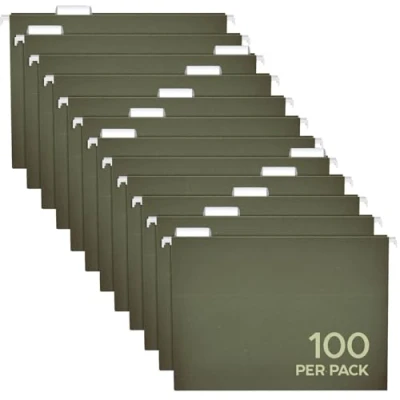 STAY CONSISTENT WITH OFFICE RECYCLING GOALS - these color folders have paper made from 100% recycled fiber with 60% post-consumer fiber yet still offer brilliant color to brighten up your space LABELS AND PRINTABLE INSERTS INCLUDED - each box of folders has 1/5-cut adjustable tabs and a sheet of blank label inserts to create neat and professional customized files SMOOTH AND SECURE HANGING WITH STURDY ROD TIPS - Designed with durable rod tips, these folders glide effortlessly in metal file cabinets, offering reliable support and minimizing wear. STOCK-UP SHOP AND DONE- This never-out necessity comes with 100 letter sized hanging drawer file folders per box and makes re-orders quick and convenient WAVE GOODBYE TO CLUTTER - Several boxes and a good filing plan puts you on your way to a clear desk and wide open spaces