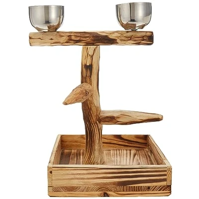 Penn Plax Bird Perch With 2 Stainless Steel Feeding Cups and Drop Tray Wood 11 Inch Height