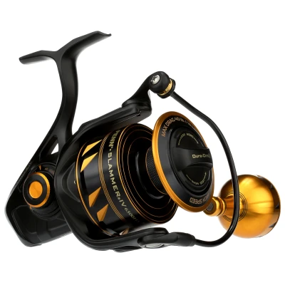 PENN Slammer IV Spinning - Choice of options - Heavy duty spinning reel - 8+1 stainless steel bearing system - Colour: black/gold - Full metal body and side plate - Finely adjustable front drag - Hydrophobic line roller bearing - Sealed Slammer slip system with Dura-Drag - CNC Gear Technology with brass main gear - IPX6 Sealed body and spool design - Very strong and robust - Great for heavy lure fishing from the boat or shore! The PENN Slammer IV Spinning is packed with features for the critcal sea angler! Building on the proven IPX6 sealed housing and spool, PENN has redesigned the Slammer drag system to not only be better sealed, but also to provide a wider range of usable resistance while supporting the bearing for extra smoothness. By adding all-brass CNC gear technology, the 8+1 stainless steel bearing system, and hydrophobic line roller bearings, the Slammer IV has become PENN’s ultimate workhorse! You can choose from the following options: Penn Slammer IV Spinning 2500 - Ball bearings: 8+1 - Line capacity: 0,23mm/235m - Gear ratio: 6,2:1 - Speed per rotation: 84cm - Weight: 312g - Drag force: 9kg Penn Slammer IV Spinning 2500HS - Ball bearings: 8+1 - Line capacity: 0,23mm/235m - Gear ratio: 7,0:1 - Speed per rotation: 99cm - Weight: 312g - Drag force: 9kg Penn Slammer IV Spinning 3500 - Ball bearings: 8+1 - Line capacity: 0,28mm/240m - Gear ratio: 6,2:1 - Speed per rotation: 94cm - Weight: 394g - Drag force: 13,6kg Penn Slammer IV Spinning 4500 - Ball bearings: 8+1 - Line capacity: 0,25mm/390m - Gear ratio: 6,2:1 - Speed per rotation: 102cm - Weight: 425g - Drag force: 13,6kg Penn Slammer IV Spinning 4500HS - Ball bearings: 8+1 - Line capacity: 0,25mm/390m - Gear ratio: 7,0:1 - Speed per rotation: 117cm - Weight: 425g - Drag force: 13,6kg Penn Slammer IV Spinning 5500 - Ball bearings: 8+1 - Line capacity: 0,28mm/390m - Gear ratio: 5,6:1 - Speed per rotation: 99cm - Weight: 629g - Drag force: 18,1kg Penn Slammer IV Spinning 6500 - Ball bearings: 8+1 - Line capacity: 0.33mm/355m - Gear ratio: 5,6:1 - Speed per rotation: 107cm - Weight: 686g - Drag force: 18,1kg Penn Slammer IV Spinning 6500HS - Ball bearings: 8+1 - Line capacity: 0.33mm/355m - Gear ratio: 6,2:1 - Speed per rotation: 122cm - Weight: 686g - Drag force: 18,1kg Penn Slammer IV Spinning 7500 - Ball bearings: 8+1 - Line capacity: 0,36mm/450m - Gear ratio: 4,7:1 - Speed per rotation: 97cm - Weight: 814g - Drag force: 22,6kg Penn Slammer IV Spinning 8500 - Ball bearings: 8+1 - Line capacity: 0.46mm/415m - Gear ratio: 4,7:1 - Speed per rotation: 107cm - Weight: 870g - Drag force: 22,6kg Penn Slammer IV Spinning 8500HS - Ball bearings: 8+1 - Line capacity: 0.46mm/415m - Gear ratio: 5,3:1 - Speed per rotation: 127cm - Weight: 870g - Drag force: 22,6kg Penn Slammer IV Spinning 10500HS - Ball bearings: 8+1 - Line capacity: 0.56mm/395m - Gear ratio: 4,2:1 - Speed per rotation: 109cm - Weight: 1216g - Drag force: 27,2kg