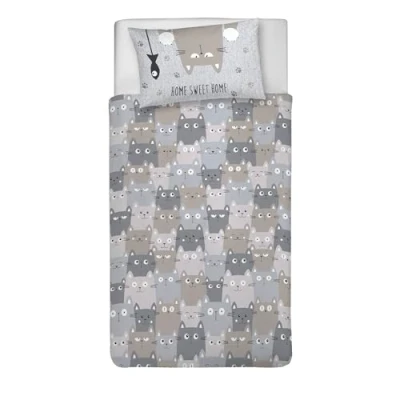 PENSIERI DELICATI 100% Cotton Single Duvet Cover Set, Complete with 1550 x 200 cm Bag and 1 Pillowcase 52 82 cm, Made in Italy, Machine Washable At 40 Degrees, Happycat Grey Pattern