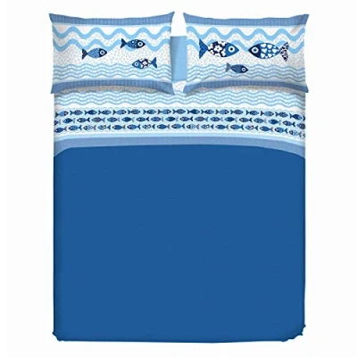 PENSIERI DELICATI Double Bed Set 100% Cotton, Complete Sheet Set, 180 x 200 cm, Including Bottom Sheet, Top and 2 Pillowcases, Made in Italy, Blue Fish Design