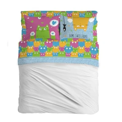 PENSIERI DELICATI Double Bed Set 100% Cotton, Complete Sheet Set, 180 x 200 cm, Including Bottom Sheet, Top and 2 Pillowcases, Made in Italy, Happycat Multicolour Pattern