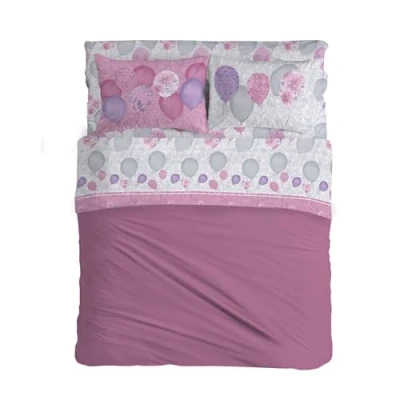 PENSIERI DELICATI Double Bed Sheet Set, 100% Cotton, 180 x 200 cm Includes Bottom Sheet, Top and 2 Pillowcases, Made in Italy, Pink Balloons Pattern