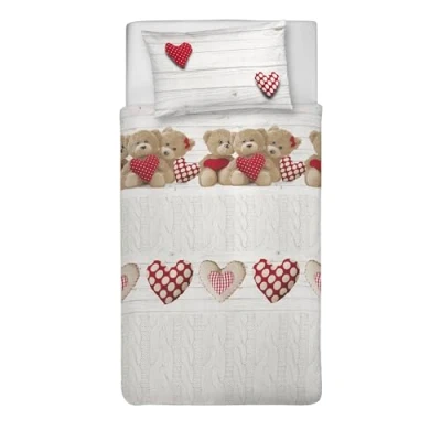 PENSIERI DELICATI Single Duvet Cover Set, 100% Cotton, Complete with 1550 x 200 cm Bag and 1 Pillowcase 52 82 cm, Made in Italy, Machine Washable At 40 Degrees, Red Bears Design
