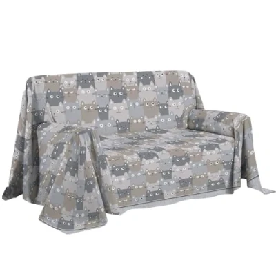 PENSIERI DELICATI Sofa Cover, 250 x 290 cm, Made in Italy, 100% Pure Cotton, Happycat Grey Pattern, Ideal as a Furniture or Summer Bedspread (Double Bed)