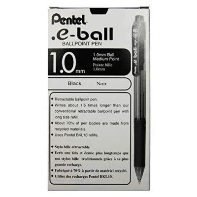The E-Ball retractable Ballpoint pen, 1.0mm tip, Black The Pentel e-ball BK130 is a popular retractable refillable ballpoint pen and ideal for everyday writing. It has a transparent barrel, pocket clip and a smooth rubber grip for comfort and control.