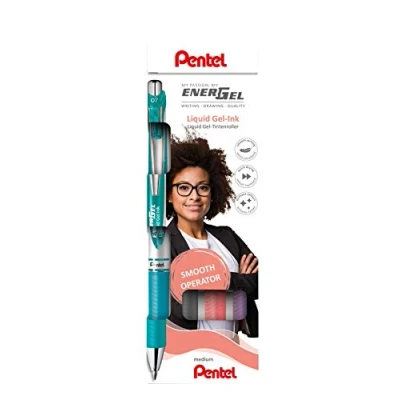 Pentel EnerGel Liquid Gel Rollerball Pen Original EnerGel ink, writes gently, dries quickly, ideal for left-handers Push mechanism and metal clip, rubberised grip zone, 54% recycled content Refillable with LR7 refill and all other EnerGel refills 0.35 mm line width = 0.7 mm ball, writing colours coral, purple, grey, turquoise