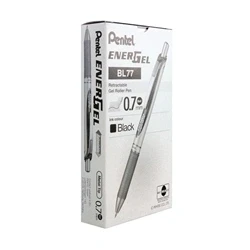 Contains quick drying EnerGel Ink. Comfortable rubber finger grip. Contains 54% recycled material based on total weight of pen excluding the ink. Medium 0.7mm nib. Push button retractable nib. Stylish metallic barrel with visible ink level.