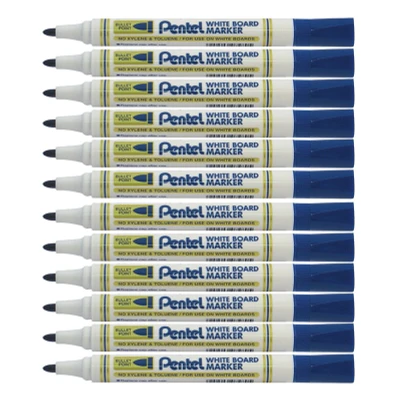 The Pentel Whiteboard Marker Bullet Tip Blue Pack of 12 features vibrant, clear pigment-based ink ideal for whiteboards and porcelain surfaces, with a 4.2mm bullet tip and anti-roll cap design for convenience and reliability—perfect for classrooms, offices, and home use.