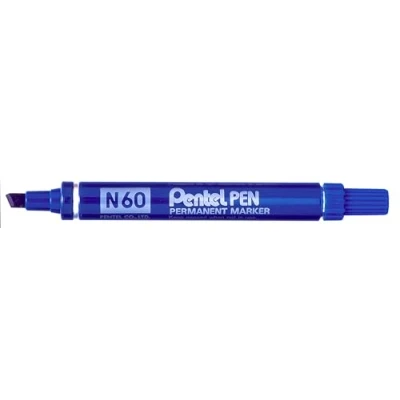 Tried and trusted chisel tip permanent marker The Pentel N60-C is one of the world’s favourite permanent markers thanks to its tough chisel point and permanent, vivid waterproof ink. Bonded fibre tip retains its shape Will write on almost any surface including cardboard, metal, wood, plastic and glass Excellent for commercial and industrial use with a robust Aluminium Barrel 5.7mm to 3.9mm tip gives a variable line width