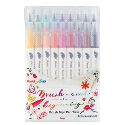 Pentel SESW30C 18 Brush Sign Pen Twin Colours Set Fibre Tip Pens with Two Flexible Writing Tips, Water Based Ink, Assorted